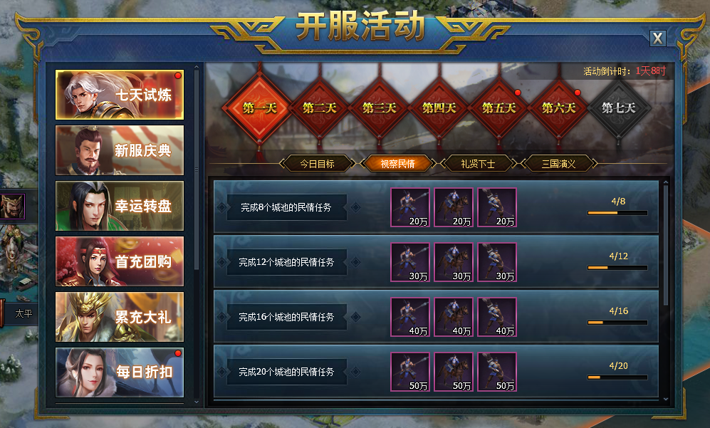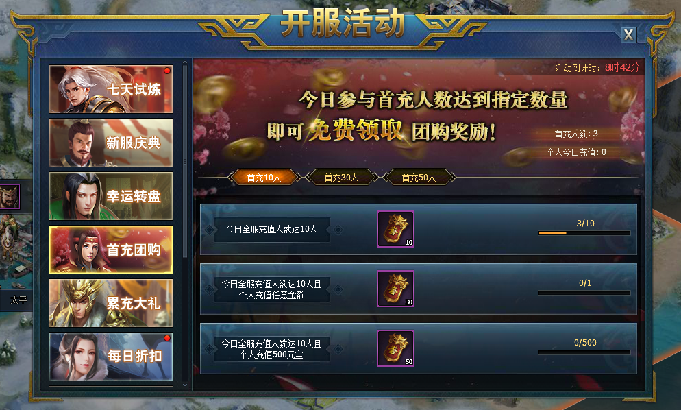 1) 活动期间,本服首充人数达到指定数量,所有主公均可领取奖励。