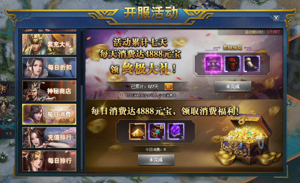 1) 活动期间,每日消费元宝数量达到指定数额,即可领取当天的消费福利!