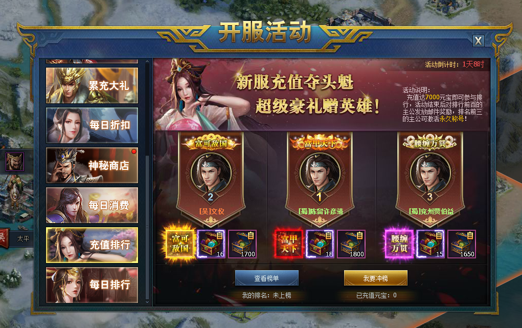 1) 活动期间,充值排行榜将记录每位主公的充值记录,在活动结束后为排行前二十名的主公发放丰厚奖励。