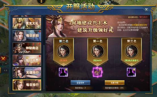 1) 活动期间,每天都会设立一个游戏内的玩法排行榜,上榜的主公在当天晚上24点将可以获得丰厚的排行榜奖励。