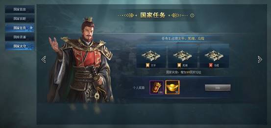 国家成员可通过共同努力,完成国家设置的各类的任务,只要任务目标达成,每位国家成员都可以领取相应的国家等级奖励。