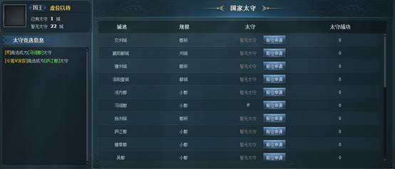 本国玩家完成城池民情任务后可申请相应的城池太守。无太守的城池,将在21:00结算,太守申请榜第1名玩家成为该城太守。太守每个季度可收到城池特产作为奖励。